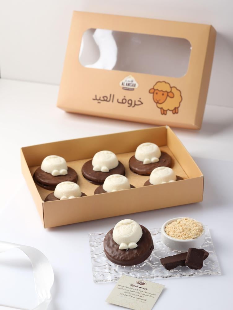- يحتوي كل بوكس على ٦ قطع من بسكويت الخروف للعيد بنكهات التمر والشوكولا.