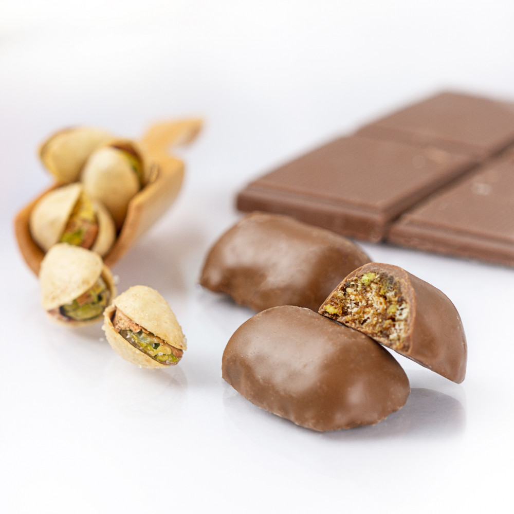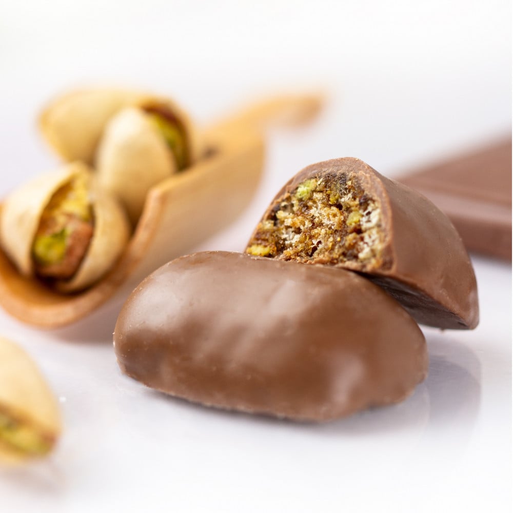 - حلويات هرميه فسق مزيج مثالي من مطحون التمر الفاخر والفستق المغطى بالشوكولاتة البنية، ليمنحكِ مذاقاً مميزاً وشيقاً في كل قضمة.
