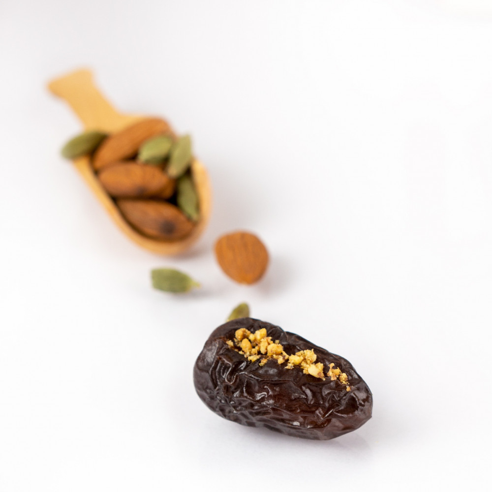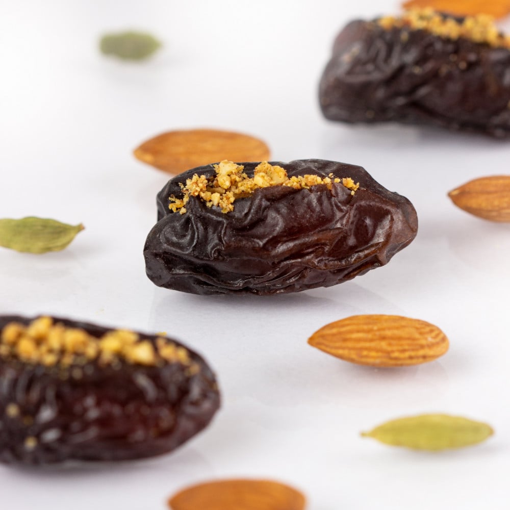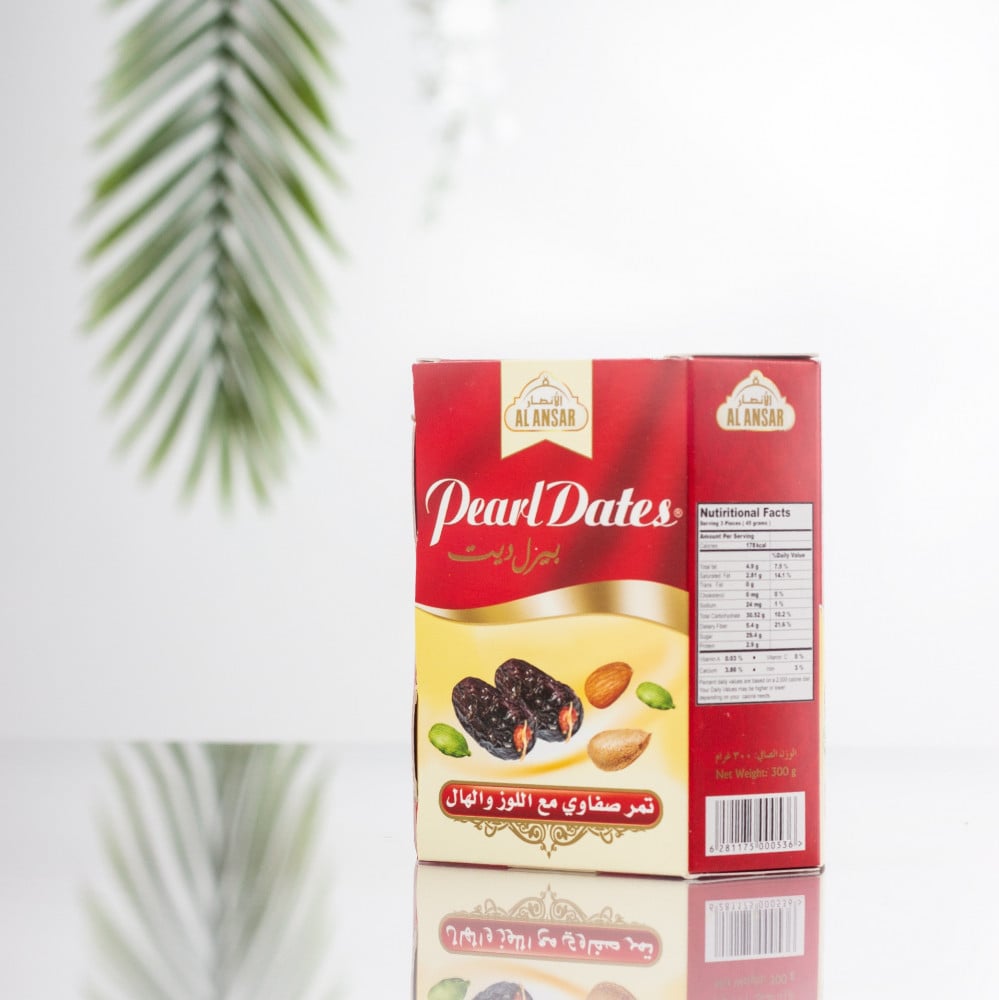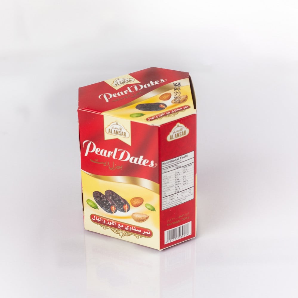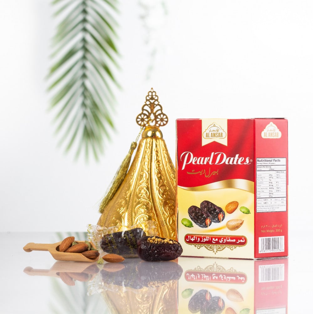 علبة أنيقة تحتوي على 300 غرام من التمر المحشي باللوز والهيل مع تغليف كل حبة من التمر الصفاوي