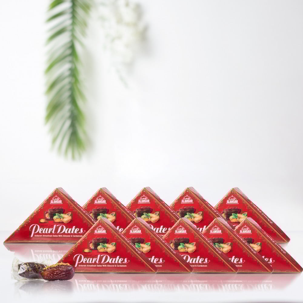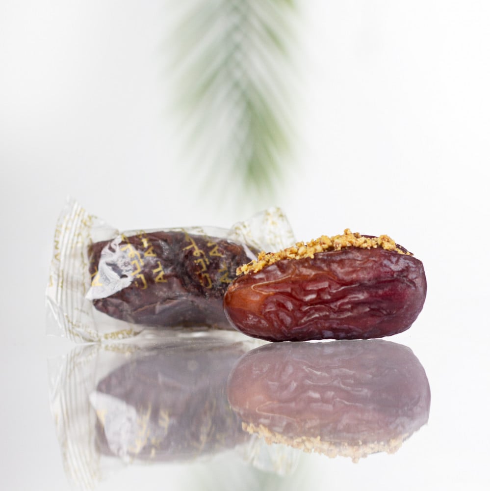 علبة أنيقة تحتوي على 300 غرام من التمر المحشي باللوز والهيل مع تغليف كل حبة على حده