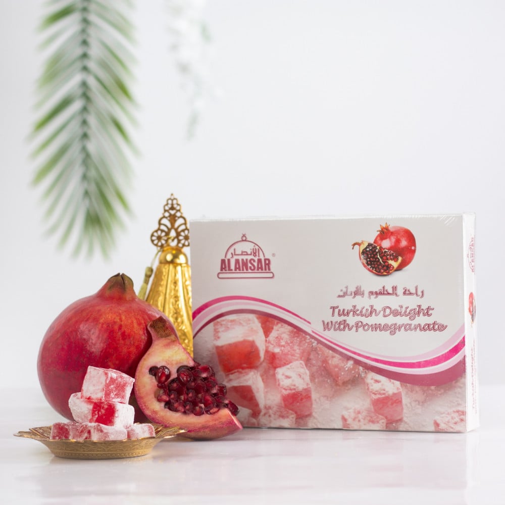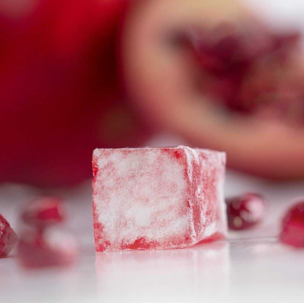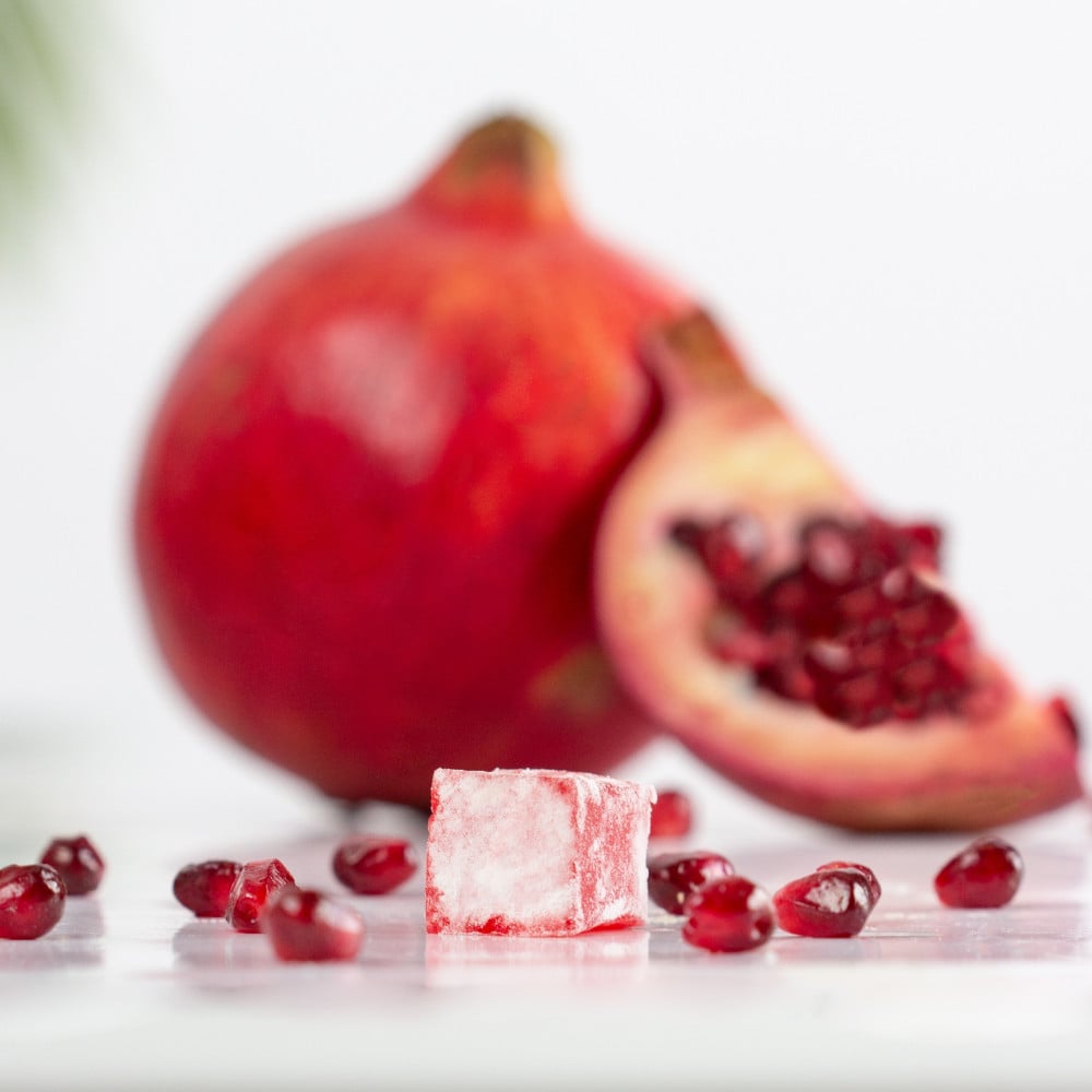 - Pomegranate Turkish Delight has a distinctive natural flavour: extracted from fresh pomegranate, which gives it a sweet, tart taste that distinguishes it from other sweets.